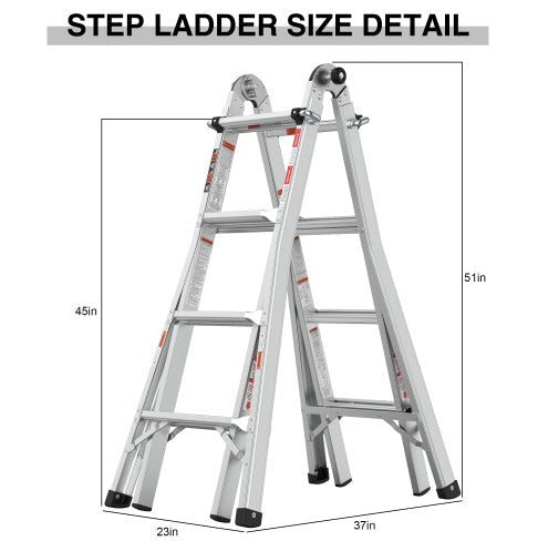 - 【MULTIPLE FUNCTIONS】This adjustable ladder can be as an A-frame ladder, trestle-and-plank,an extension ladder, a staircase and 90-Degree ladder. Perfect for replacing light bulbs, repairing roof, decorating birthday parties, painting walls, washing windows, etc.